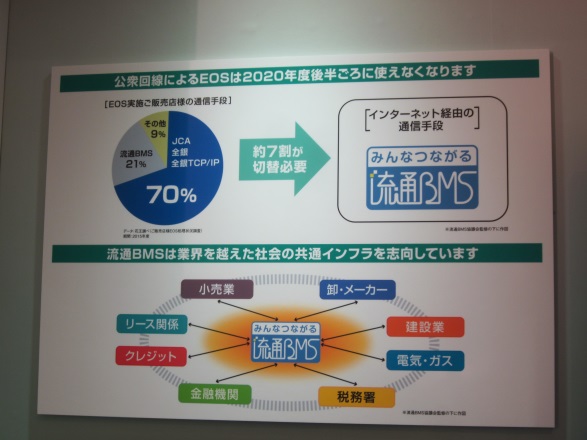 今年度はイベント上で、「サプライチェーンの最適化」ブースを設置し、NTTの回線網移行を周知し、協議会監修の図などを使用し流通BMSの導入を促した。